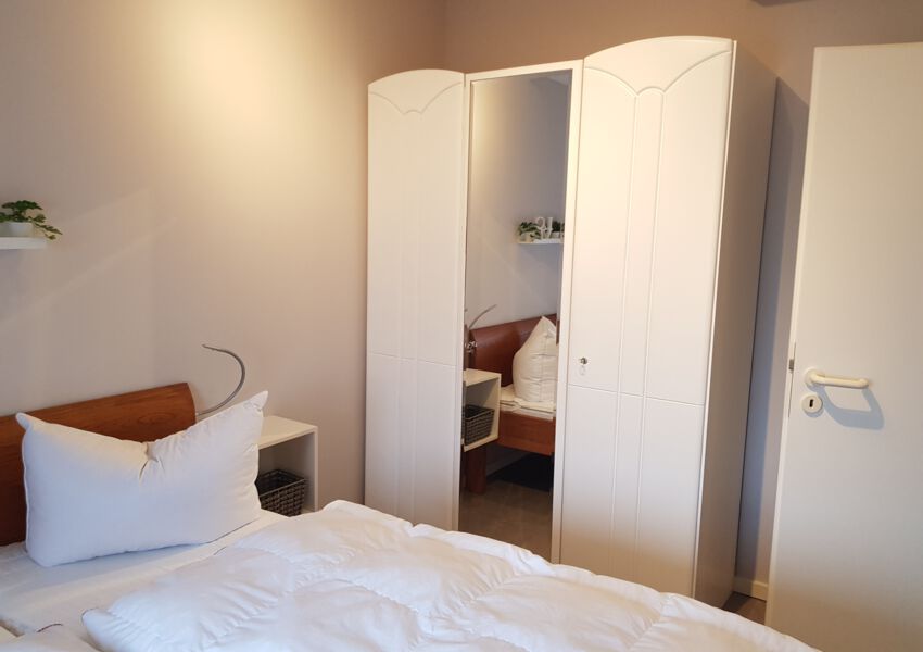 • Schlafzimmer mit großem Doppelbett und Kleiderschrank